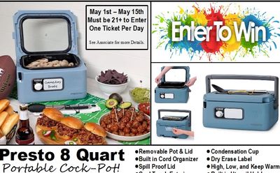 Right in time for Memorial Day celebrations and summer BBQ season! Be ready for your next event with this portable crock-pot! With it's locking lid and removable tray, you'll be the envy of the potluck! Convenient settings of high, low, and keep warm its perfect for any dish. The dry erase label makes sure no one misses what you've brought to share. One ticket per day per person. Running until May15th! Must be 21+ to enter. No purchase necessary. Stop in today to drop in your ticket!